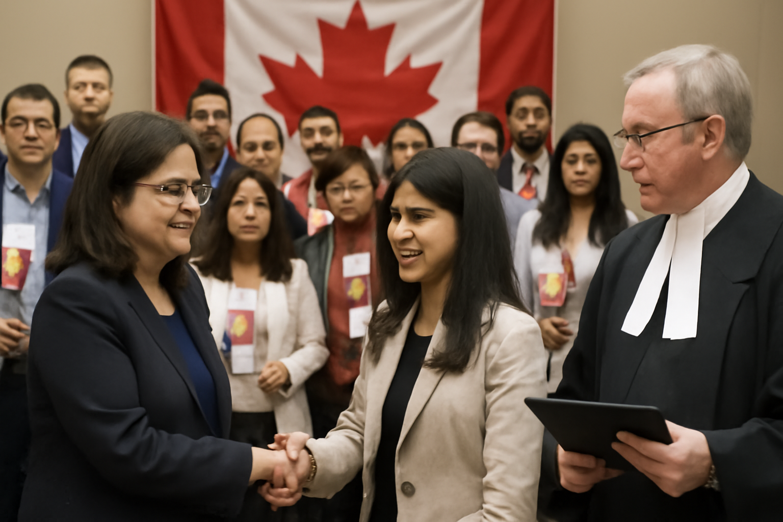 新市民が宣誓を行い、判事の監督のもとで市民権が授与されます。大臣が出席し、参加者を歓迎します。